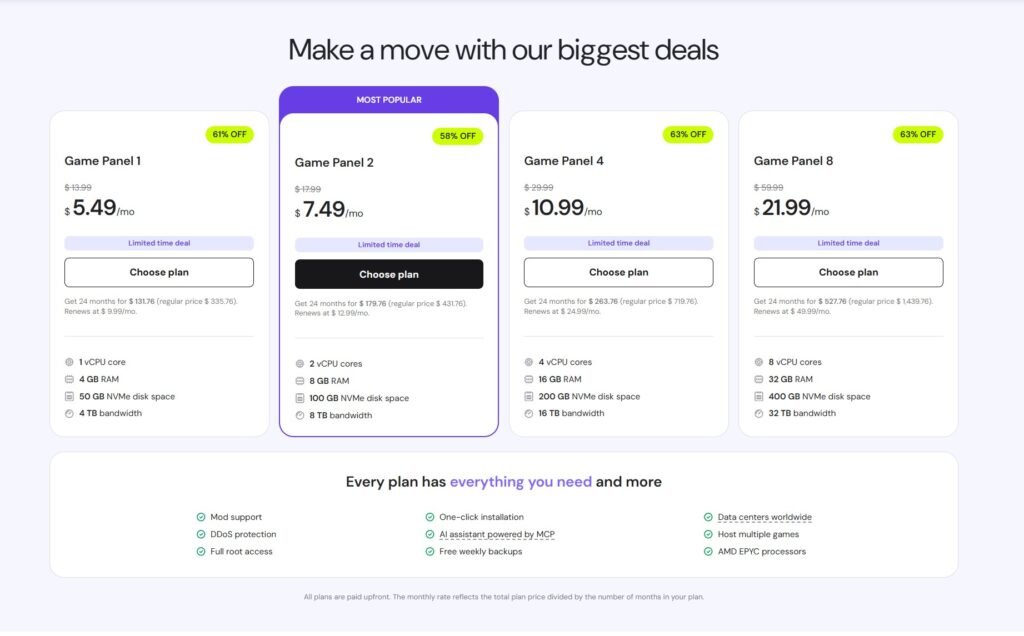 | Hostinger Game Panel | Cleanest Interface | ~$5.99/mo |
